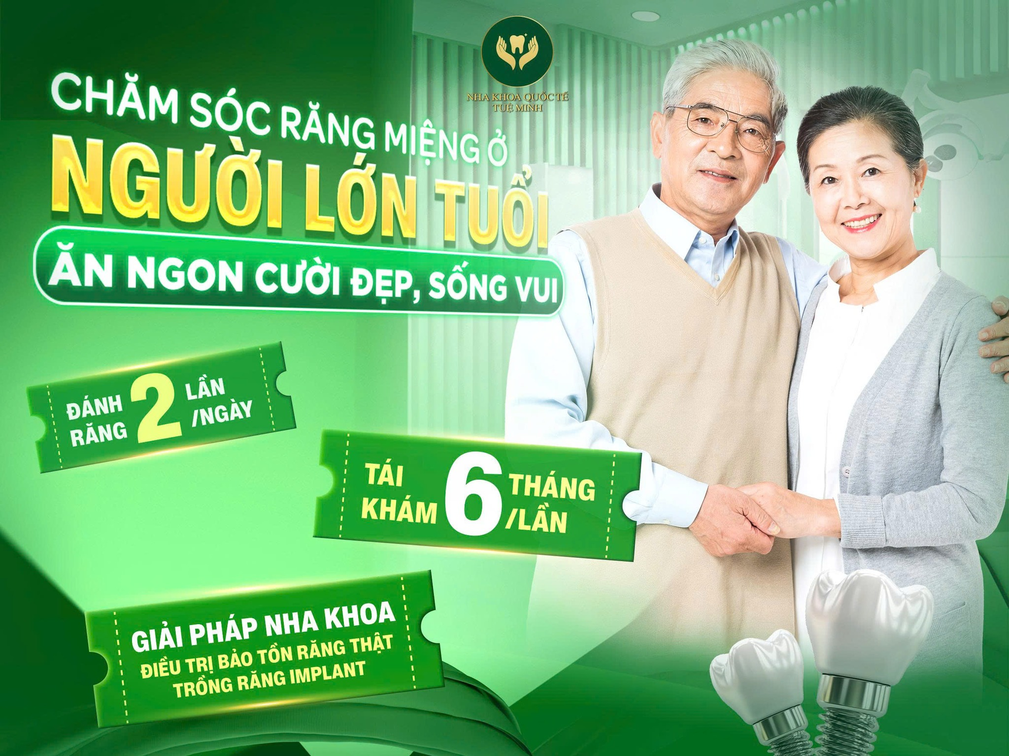 Đừng để tuổi tác làm phai nhạt nụ cười của bạn. Bằng cách kết hợp chăm sóc răng miệng khoa học hằng ngày với các giải pháp nha khoa hiện đại, người cao tuổi hoàn toàn có thể duy trì răng thật lâu dài, ăn uống ngon miệng và tự tin mỗi ngày.